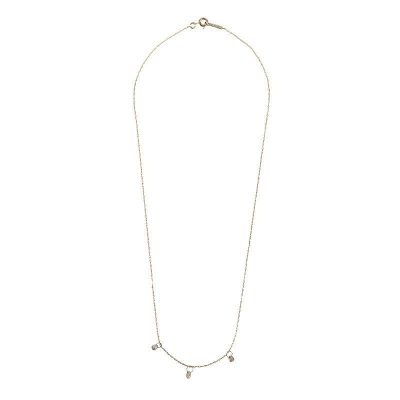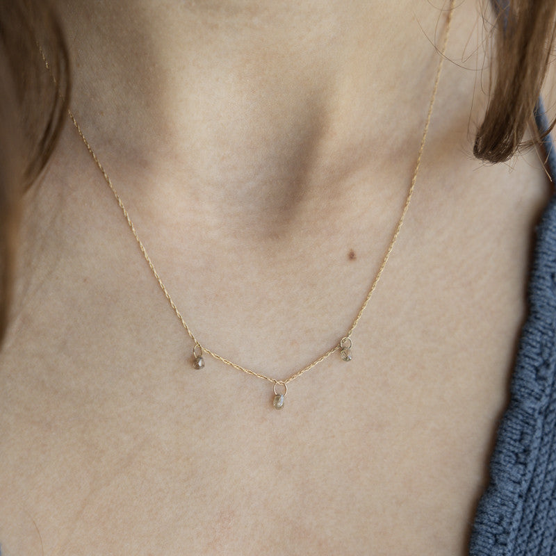 La forme en poire de ses trois gemmes signe un style ultra féminin et différent. Les pierres précieuses rayonnent en douceur, grâce à leur couleur, qui se fond dans la peau. La chaîne en Or 585/1000 et sa teinte claire s'harmonise parfaitement avec les diamants bruns, qu'elle sublime sans excès.