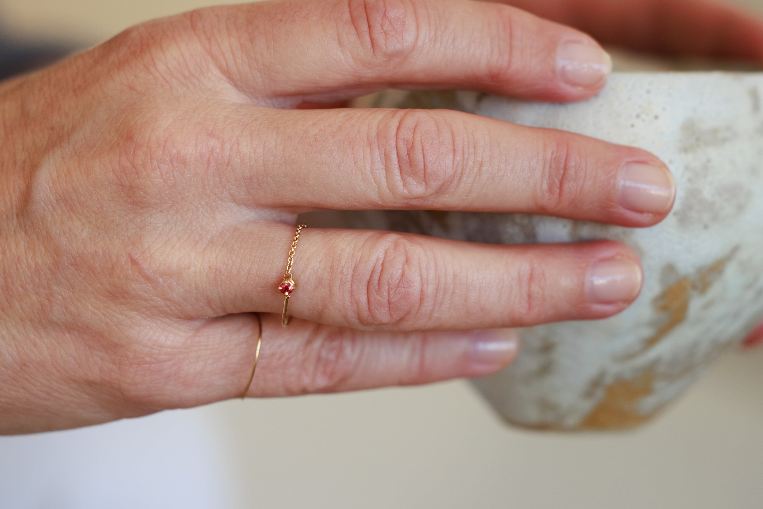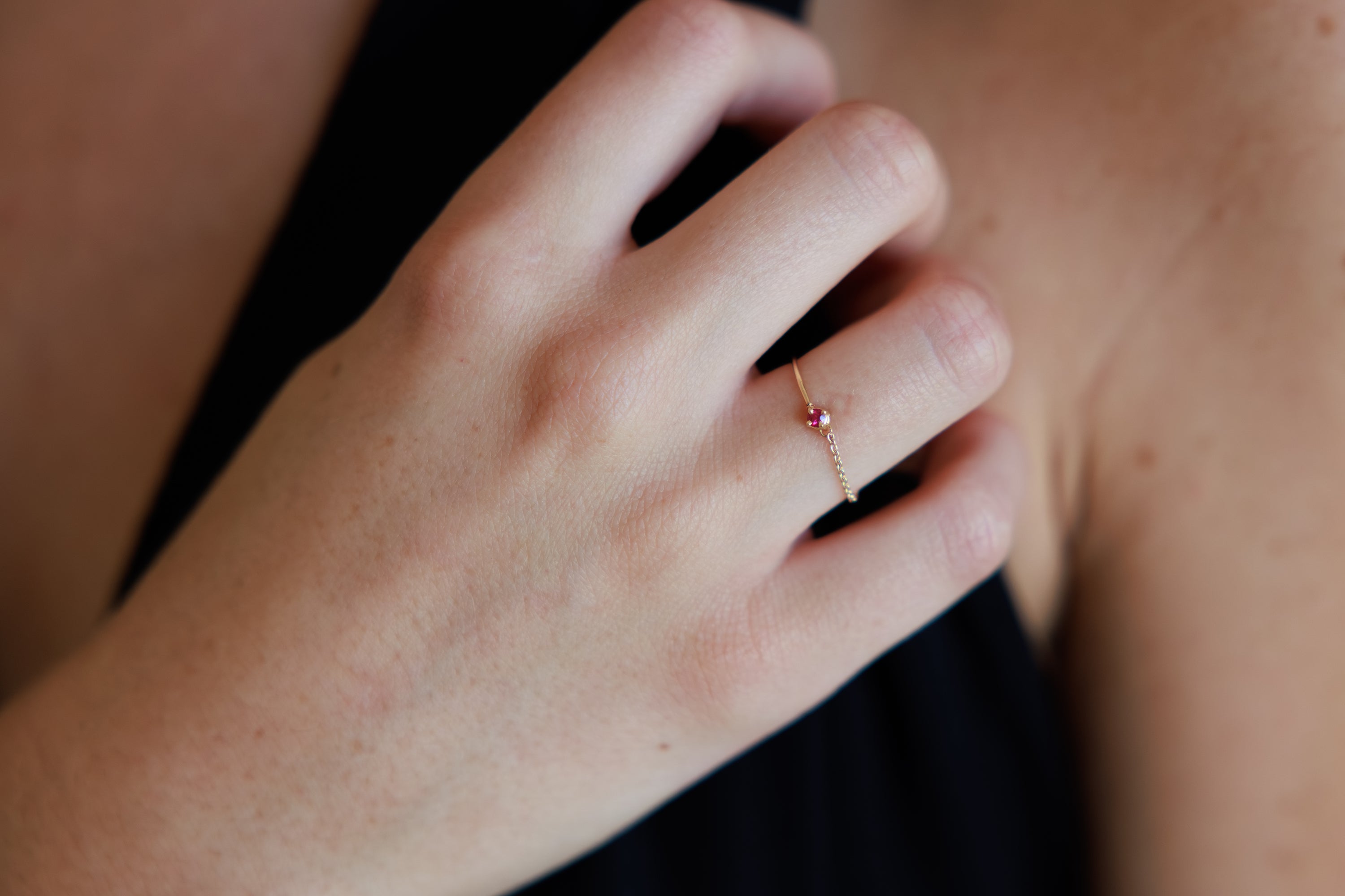 Cette bague de la collection Pigment combine un anneau en or épuré avec un segment de chaîne et un rubis. Elle reflète le caractère singulier, brut mais sophistiqué de la marque, en apportant une touche à la fois authentique et élégante.