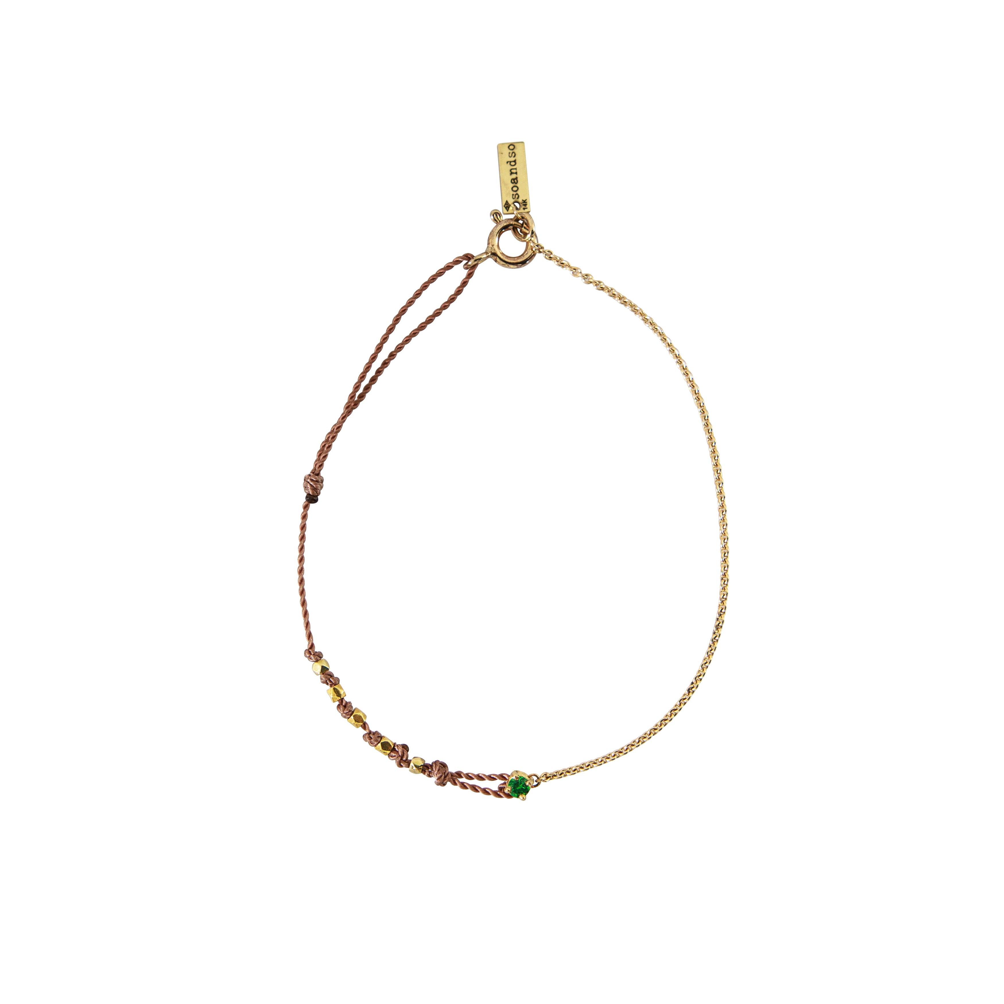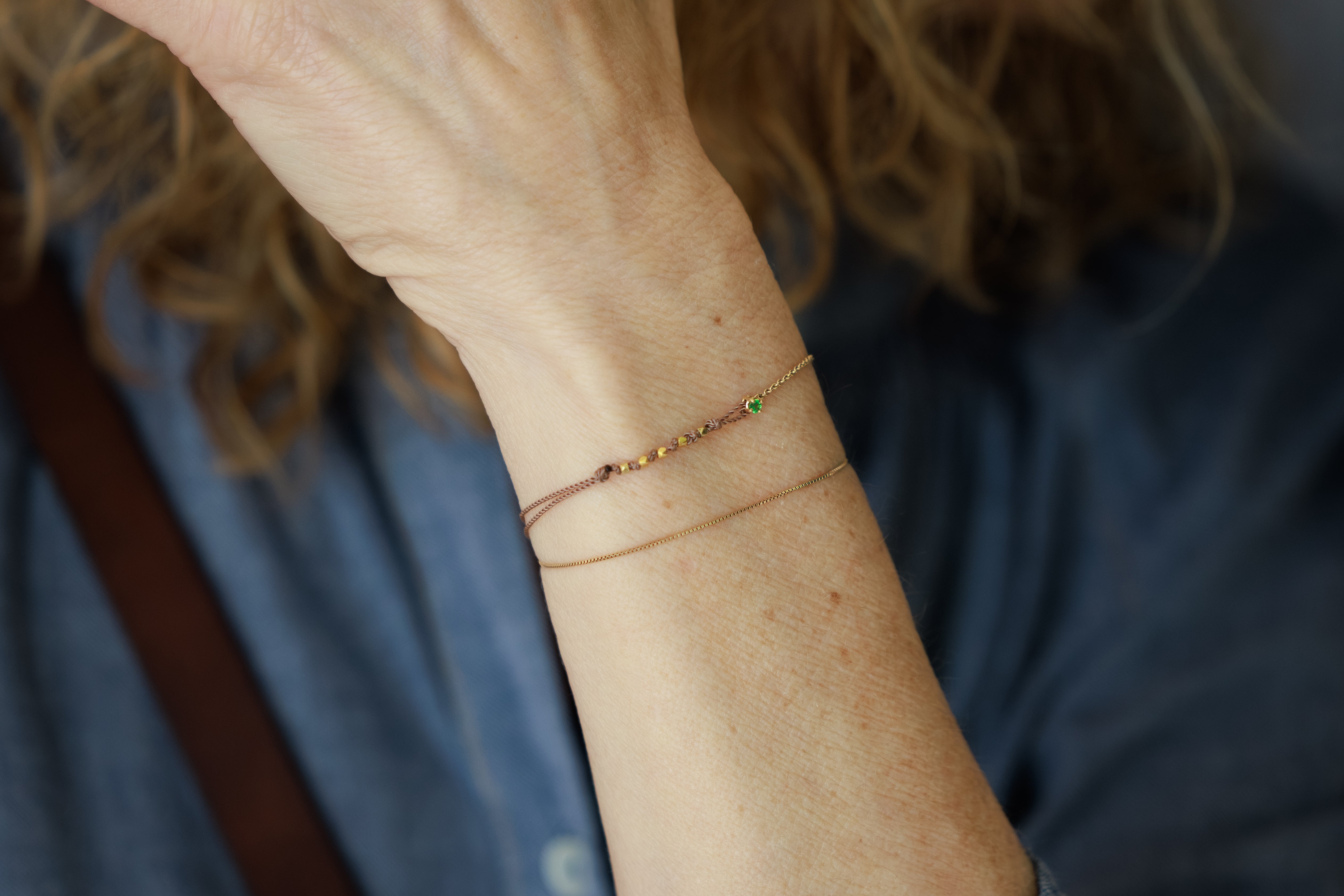 Bracelet minimaliste à la fois brut et délicat, il allie une chaîne en or et un cordon ajustable, ponctué de petits hexagones en or et d'une Tsavorite. Il incarne une esthétique à la fois authentique et sophistiquée, fidèle à l'univers de la marque, parfait pour une touche d'élégance naturelle au quotidien, le cordon est réglable, le mélange chaîne
