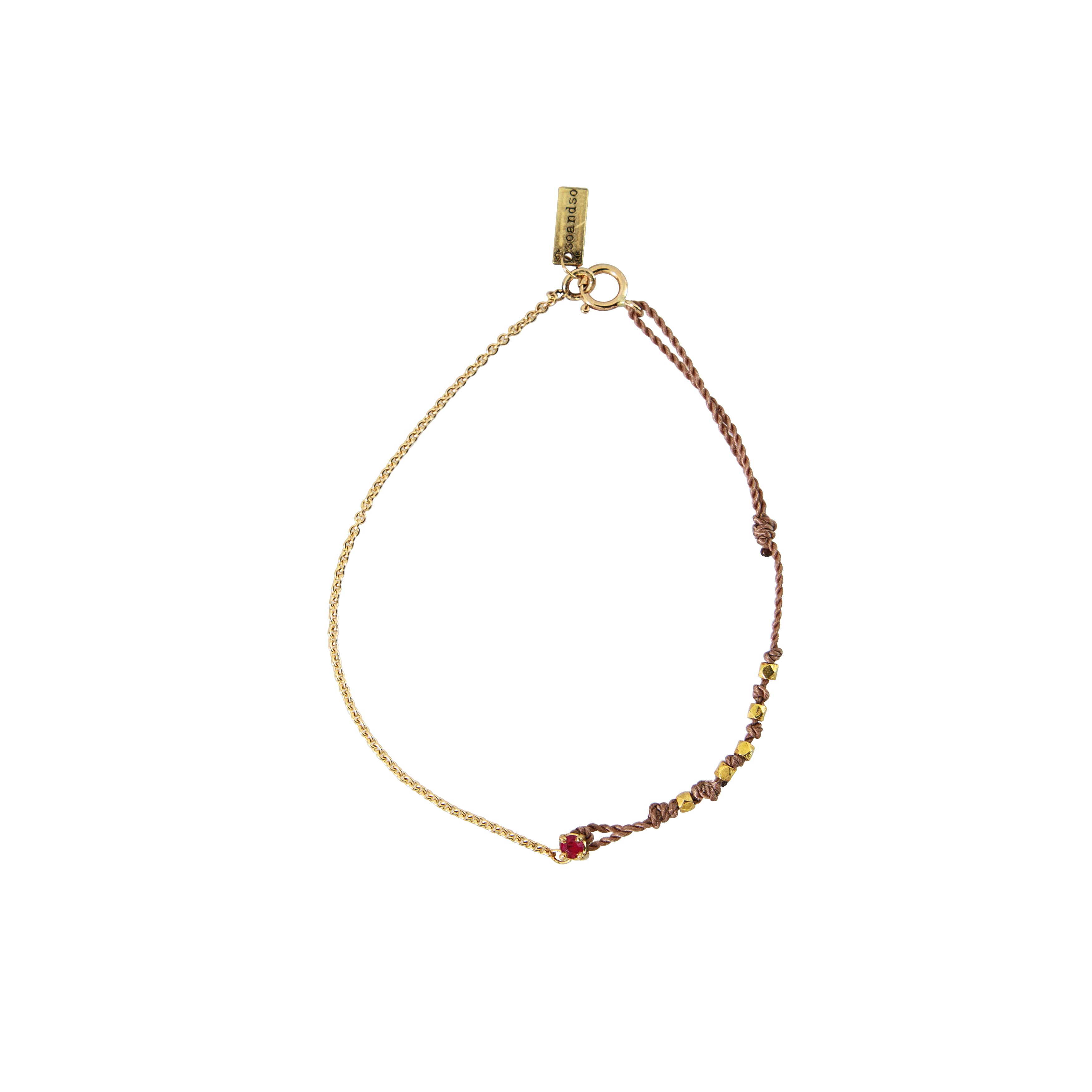 Bracelet minimaliste à la fois brut et délicat, il allie une chaîne en or et un cordon ajustable, ponctué de petits hexagones en or et d'un rubis. Il incarne une esthétique à la fois authentique et sophistiquée, fidèle à l'univers de la marque, parfait pour une touche d'élégance naturelle au quotidien, le cordon est réglable, le mélange chaîne