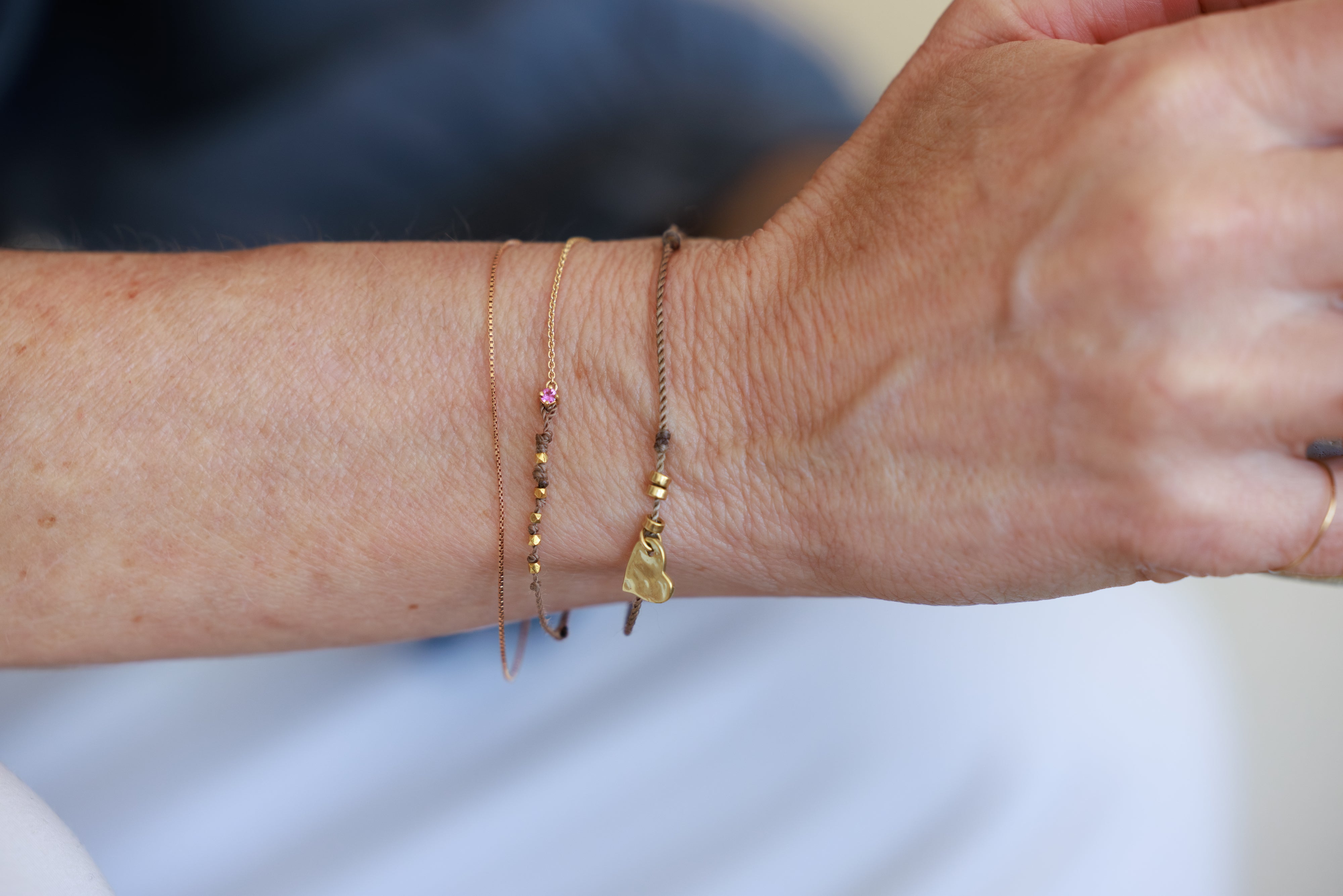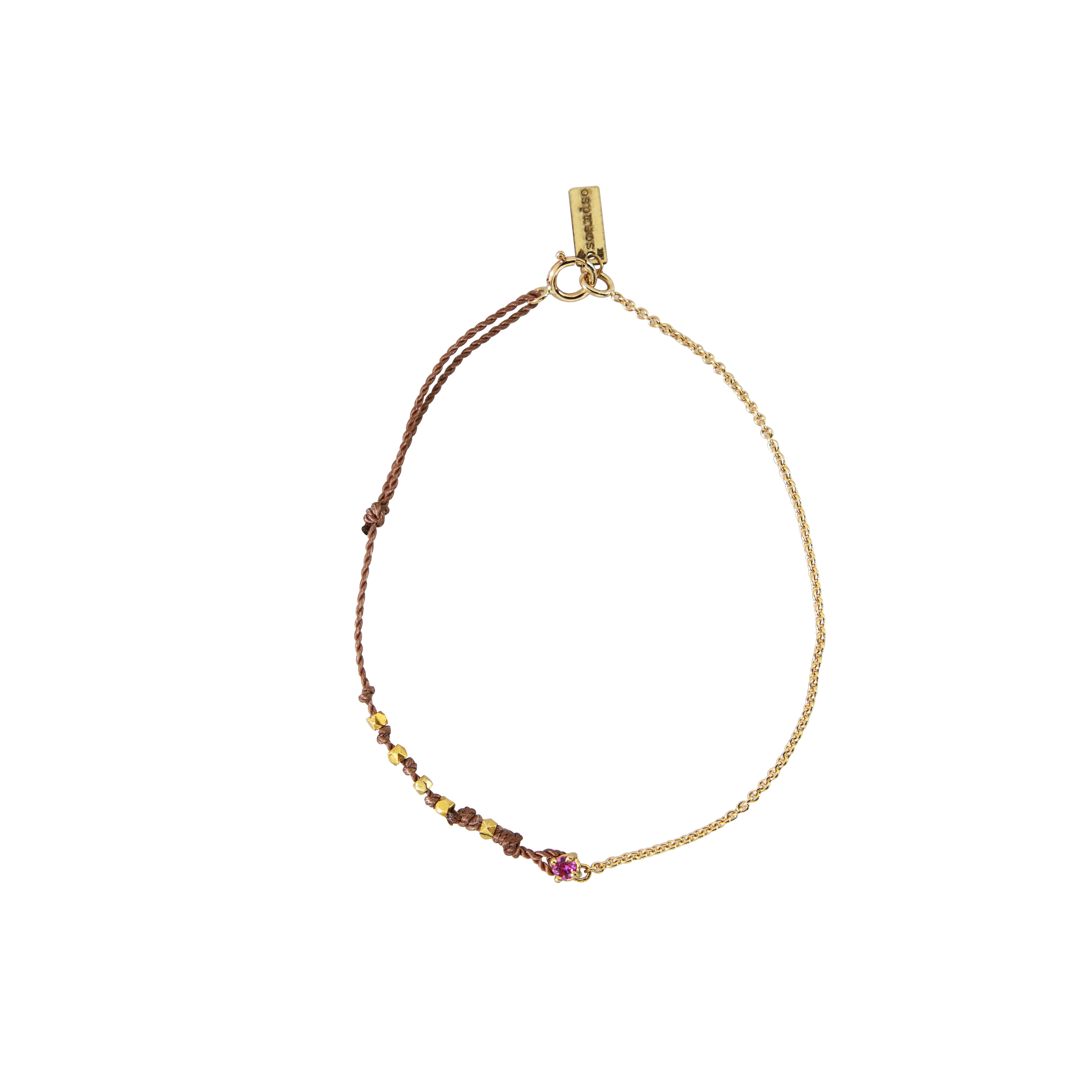 Bracelet minimaliste à la fois brut et délicat, il allie une chaîne en or et un cordon ajustable, ponctué de petits hexagones en or et d'un saphir. Il incarne une esthétique à la fois authentique et sophistiquée, fidèle à l'univers de la marque, parfait pour une touche d'élégance naturelle au quotidien, le cordon est réglable, le mélange chaîne